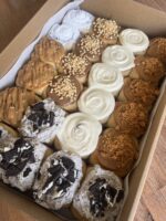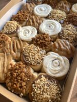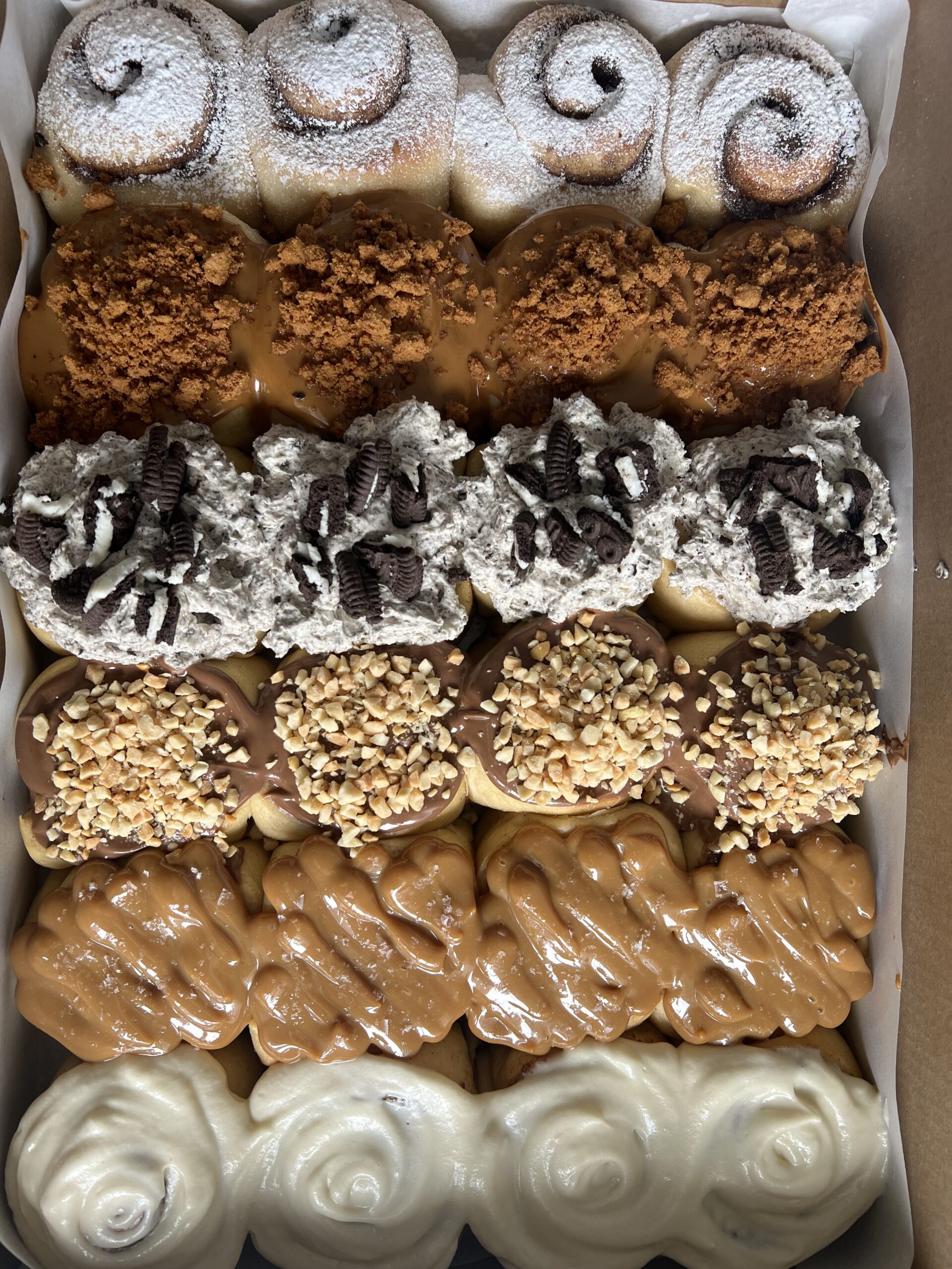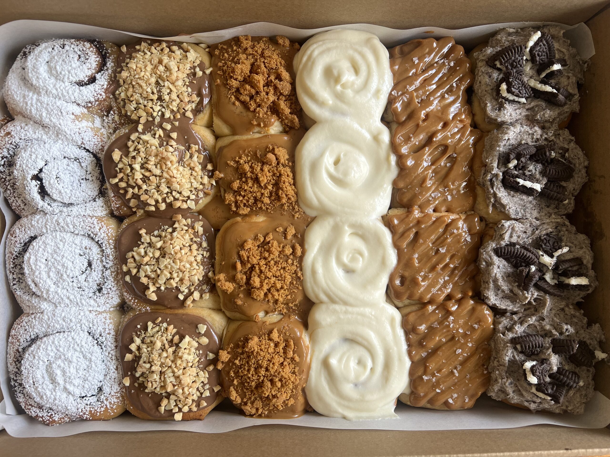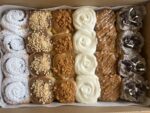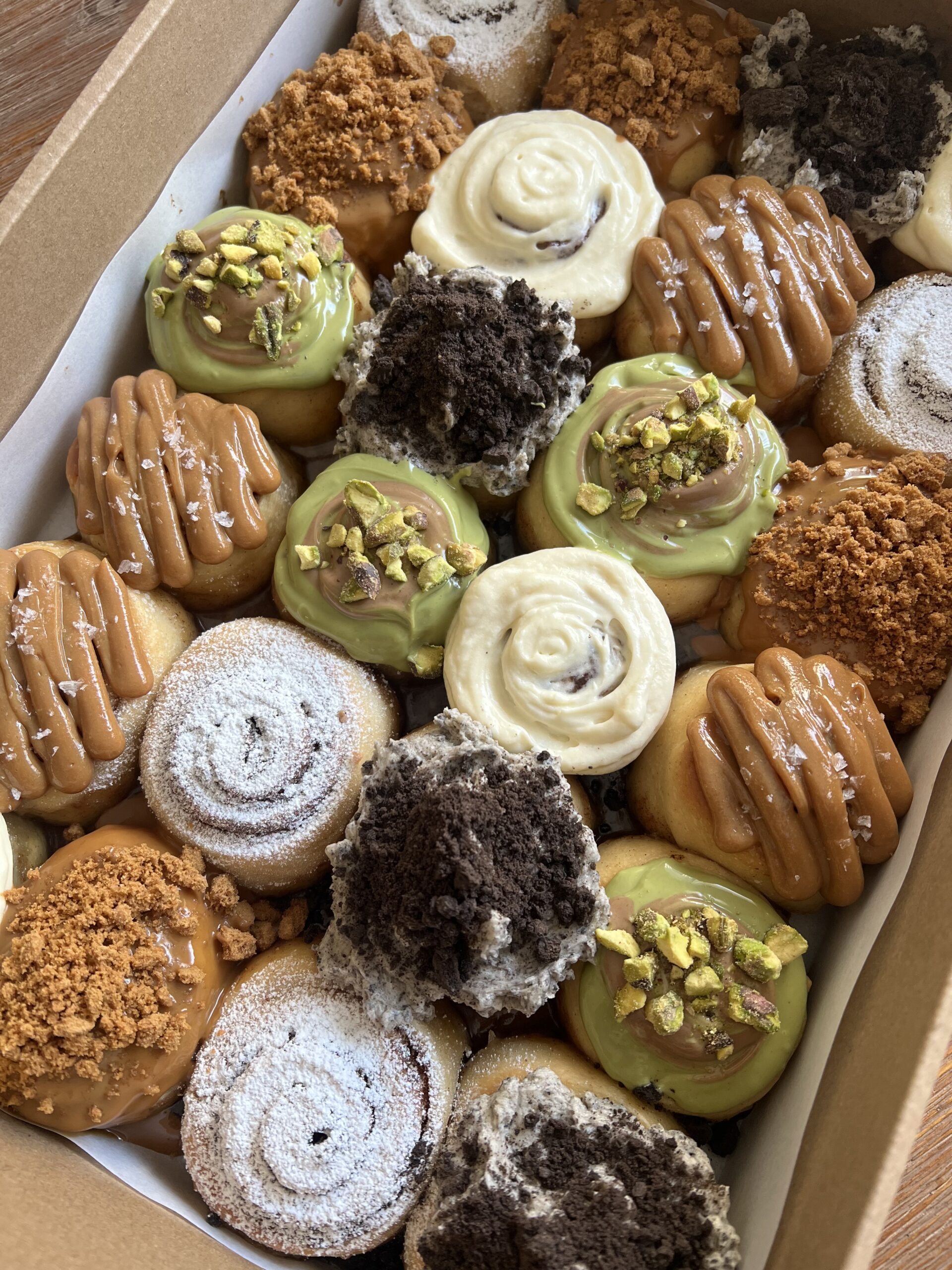 Go big with our generous box of 24 delicious mini cinnamon rolls—the easiest way to guarantee smiles at your next event. This is the perfect party starter, ideal for any celebration, office morning tea, or large gathering. Why limit yourself? With 24 perfect mini rolls, you get to fully customise your mix, ensuring every single person finds their favourite flavour. Just pick your 24 rolls from the menu and prepare for the compliments!
